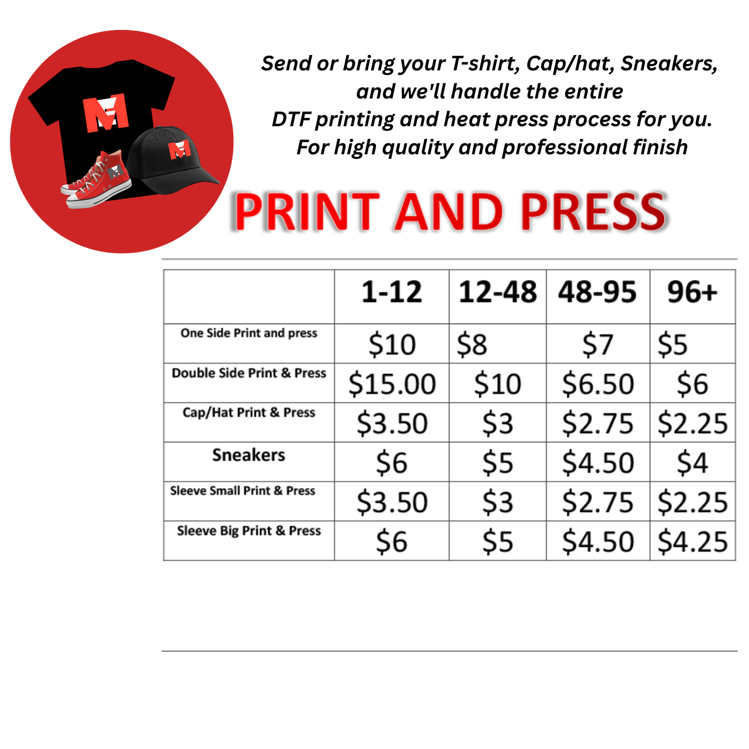 Send or bring your T-shirt, Cap/hat, Sneakers, and we'll handle the entire DTF printing and heat press process for you.